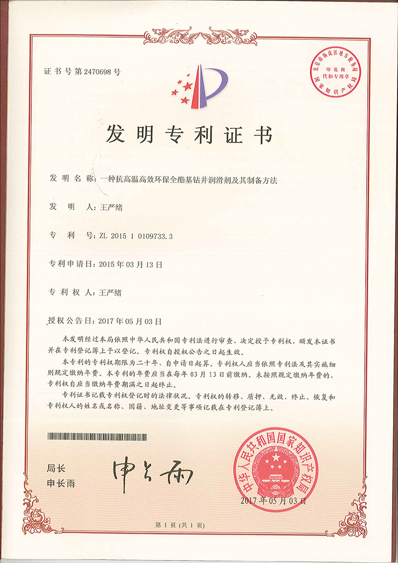 榮譽資質(zhì) 當前位置:首頁 > 榮譽資質(zhì) > 一種抗高溫高效環(huán)保全酯基鉆井潤滑劑及其制備方法